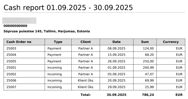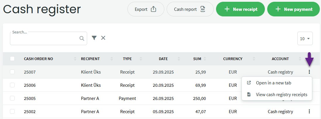 If a single cash transaction is related to multiple invoices, it is better to enter it from the Cash registry view and link it to the necessary invoices (Actions menu -> Bind receipt to an invoice/Bind payment with purchase invoice).