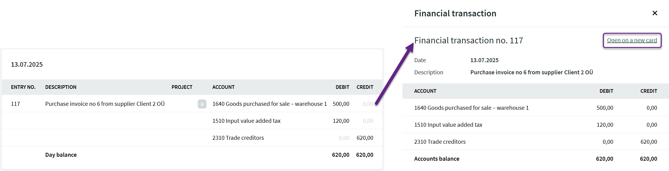 Clicking a transaction row opens the corresponding financial transaction. Clicking “Open on a new card” opens the transaction view, from where the transaction can be opened for editing if necessary.