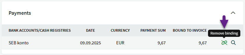 Option 2 When the purchase invoice is open for viewing, scroll down a bit to see the “Payments” section. It displays the details of the linked payment, and there are two icons at the end of the line. The one on the right (magnifier) opens the payment view, while the one on the left (Remove binding) allows you to unlink the payment from the purchase invoice. After removing the link, you will remain in the purchase invoice view.