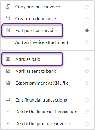 From the Actions button, select “Edit purchase invoice.” Make the necessary changes to the invoice and save it again.