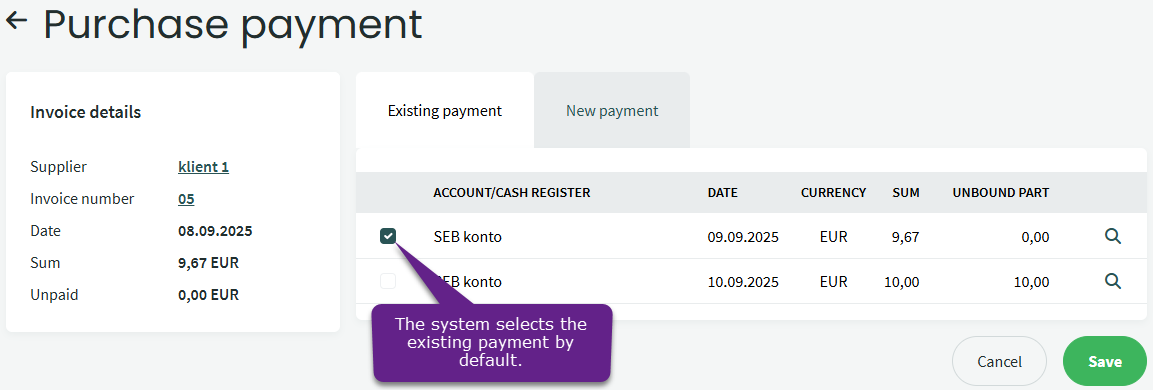 ● Unlinking a payment from a purchase invoice does not delete the payment, so you can link it back later. From the Actions button, select “Mark as paid.” The system will suggest the existing payment, and you just need to click “Save.” If there are multiple pending payments for the supplier, select the appropriate one.