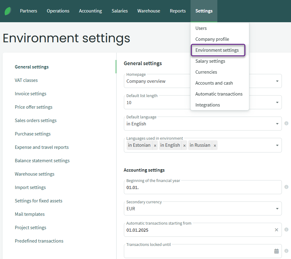 In the menu, go to Settings -> Environment settings, where you can configure general rules for the program regarding entry creation (start date for automatic entries, locking, predefined entries), document numbering, and many other options. We will review them in the order they appear in the menu.