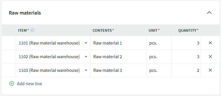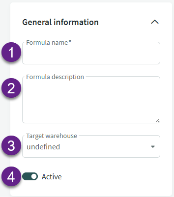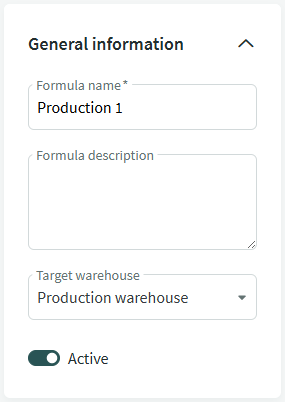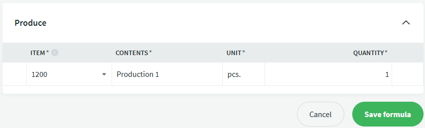 If a company is engaged in production, formulas can be used to simplify the entry of production. A formula defines the composition of a specific finished product, specifying the raw materials (components) to be used and their quantities. Each formula is linked to one specific finished product – it is not possible to include multiple different finished products in a single formula.