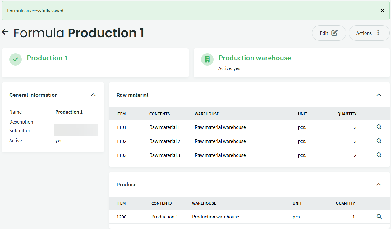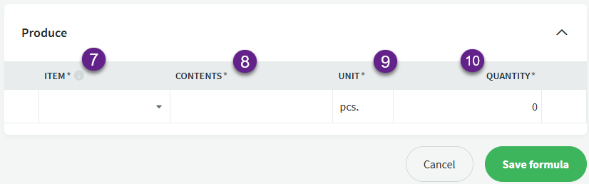 ● We recommend creating a formula for one unit of the finished product. When entering a production, the quantity of finished product can be adjusted, and the raw material quantities will be automatically recalculated. The formula can also be modified or deleted after it has been used in production.If you have any additional questions, please write to us at support@simplbooks.ee