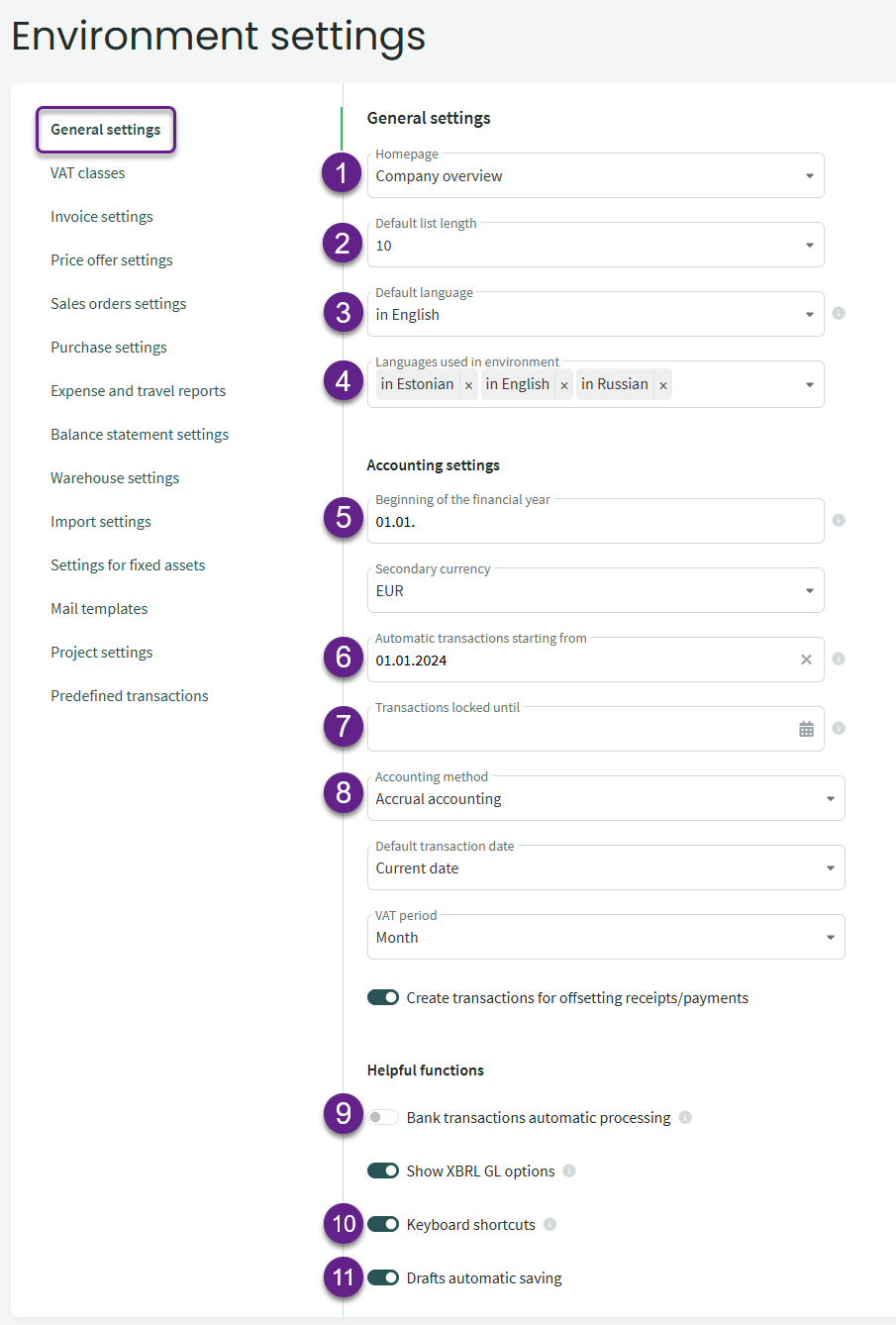- Beginning of the financial year – usually coincides with the start of the calendar year. If a different period was chosen when the company was established, it must be specified here. If the beginning of the financial year is changed, the previous period must be closed and transactions locked before making the change. It is also recommended to update the start date for automatic transactions accordingly.