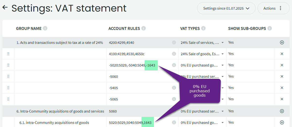Add the necessary inventory account (for example 1643 Warehouse – intra-Community purchases) to the account rules for line 1 “0% EU purchased goods” under the VAT type. Separate the account from other accounts with a comma, do not leave a space in between and be sure to use a minus sign before the account.