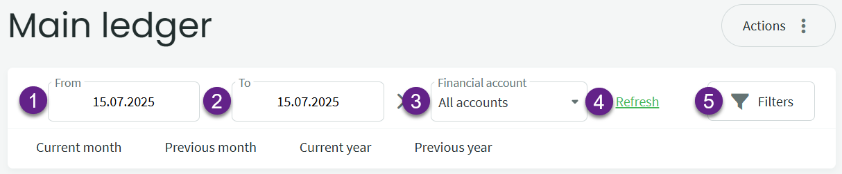 ● The letter “A” in the entry row indicates that the entry was created by the system, not manually entered, and has not been modified by the user. ● To export the main ledger, click the Actions button (at the top right of the report) and select “Report export“. In the window that opens, you can see the available formats for saving the report and also choose to print it.If you have any additional questions, please write to us at support@simplbooks.ee