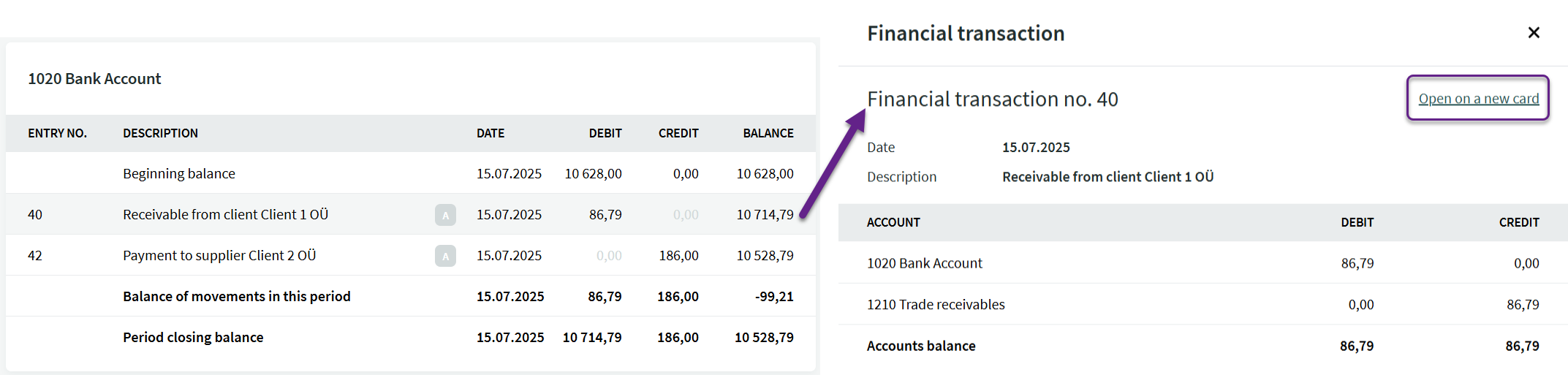 ● Clicking a transaction row opens the corresponding financial transaction.Clicking “Open on a new card” opens the transaction view, from where the transaction can be opened for editing if necessary.