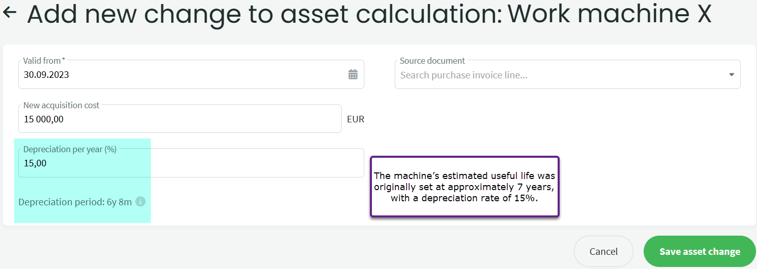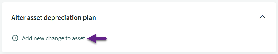 On the fixed asset card, you will see the panel “Alter asset depreciation plan”. To add a new change, click on “Add new change to asset”.