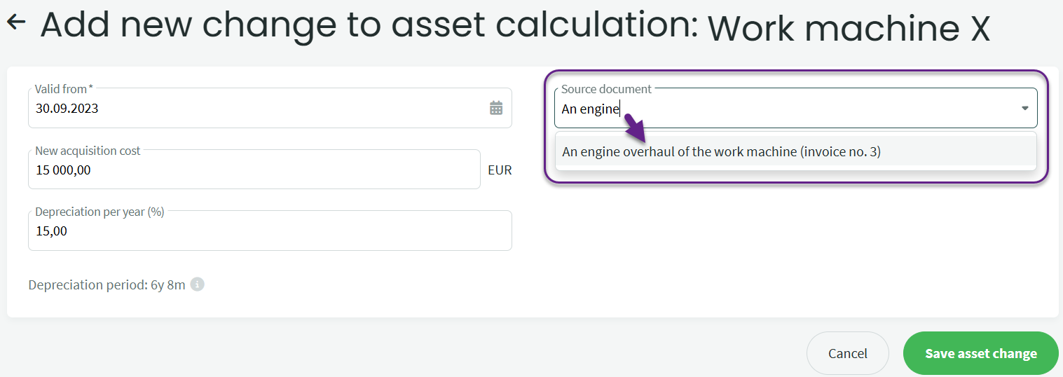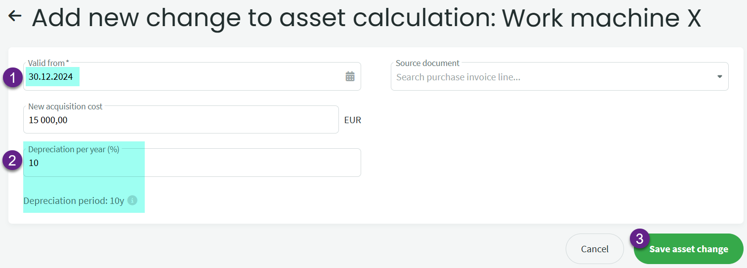 To make a change, go to the fixed asset card: Accounting -> Assets and open the fixed asset card you wish to modify.