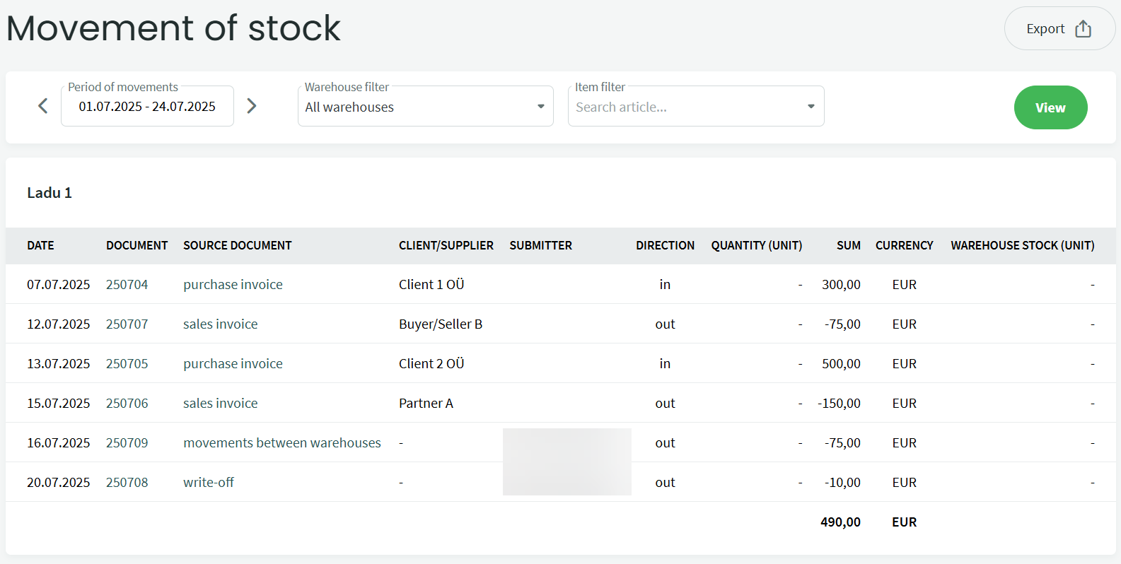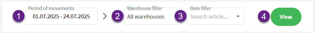 - Warehouse filter – displays movements for the selected warehouse. If not selected, all active warehouses are shown