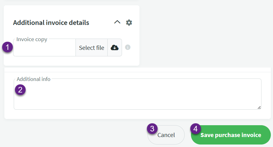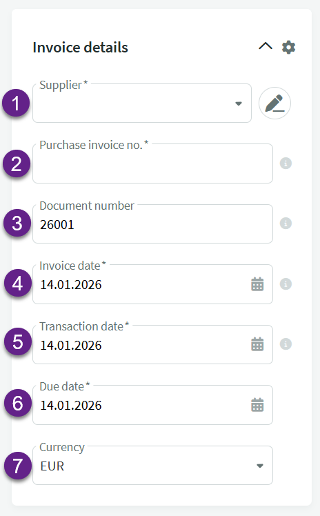This guide provides information about the fields available in the purchase invoice entry view. A purchase invoice can be entered manually or imported as an e-invoice.