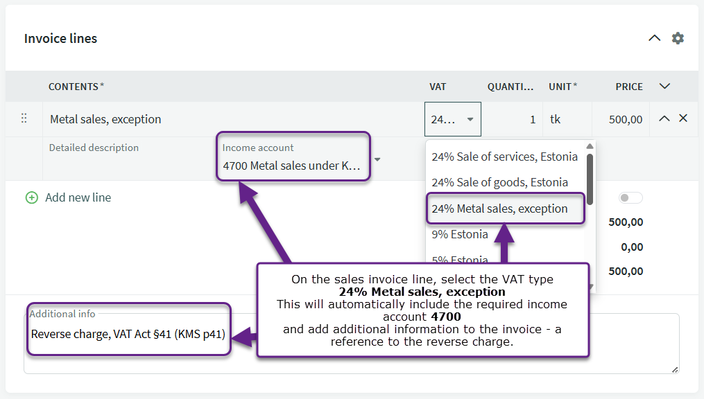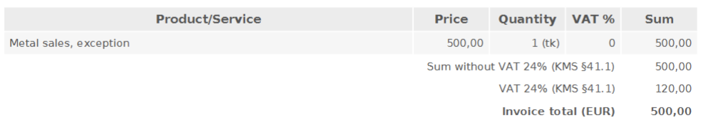 In the case of the sale of metal products listed in Section 41¹ 2 clause 5 of the Value-Added Tax Act , the VAT type 24% Metal sales, exception must be used on the sales invoice. The income account for this VAT type must be account 4700 Metal sales under KMS p41 special arrangements.
