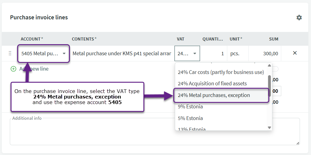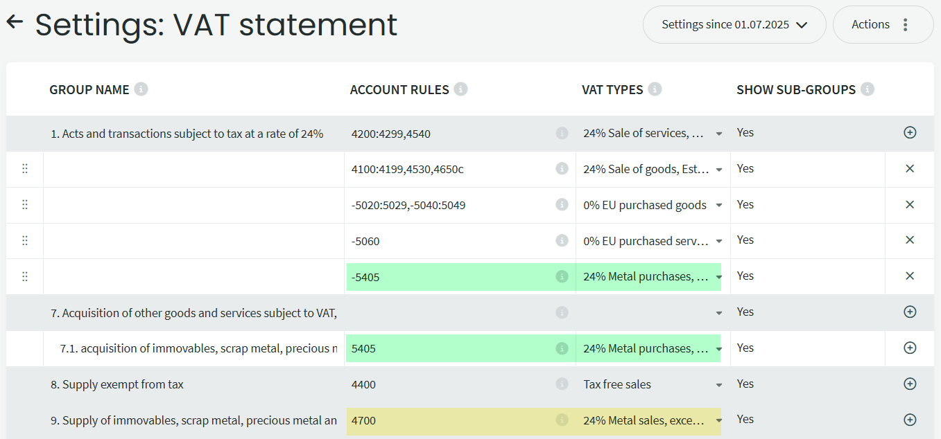 Since VAT statement data is based on the account + VAT type, it is also possible to use other expense accounts for metal purchases. In that case, you must manually add the required expense account in the statement settings.