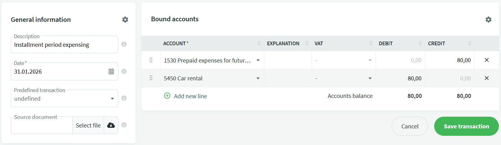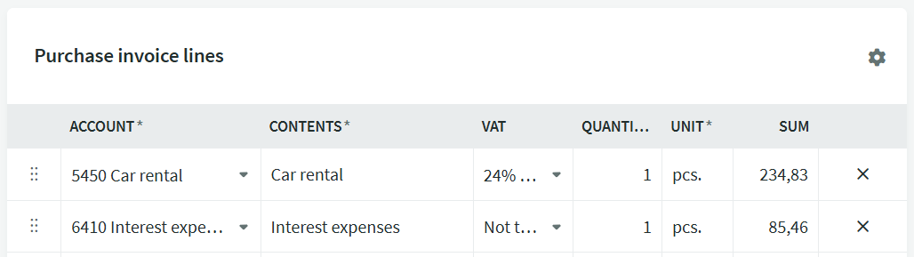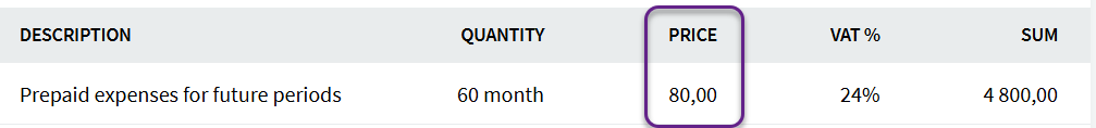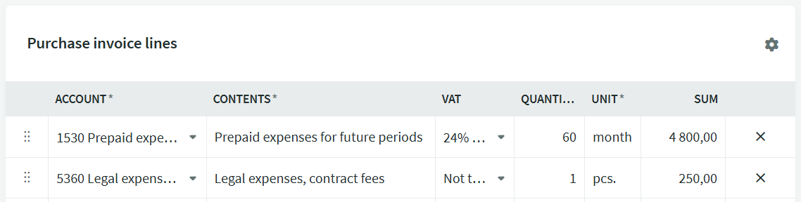 The first line is suitable for account 1530 Prepaid expenses for future periods. In the quantity field, you can enter the rental period length in months and in the amount field, enter the down payment amount excluding VAT. When saving the invoice, you will also see the monthly amount.