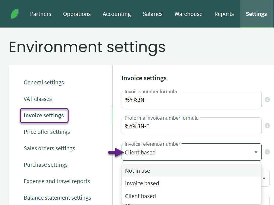 - Client based – the system generates an individual reference number for each new client . The number starts with “9”, followed by a four-digit unique combination and ends with a check digit, e.g. 900414. The reference number is not created immediately when the client is added, but when the first invoice is issued. After that, the same reference number will be used for all invoices of that client.
