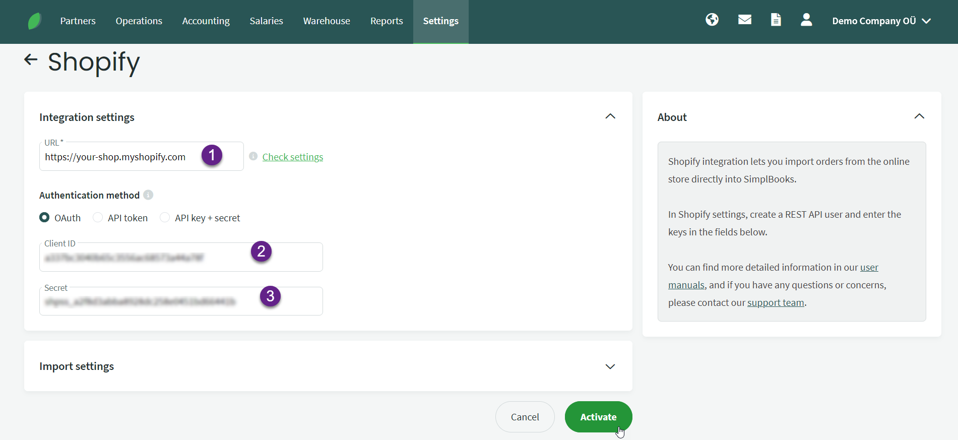 As the last step log into your SimplBooks environment and open “Settings -> Integrations -> Shopify“. Enter your shop URL (URL format: https://your-store-name.myshopify.com), Client ID and Secret into settings (OAuth). Activate!