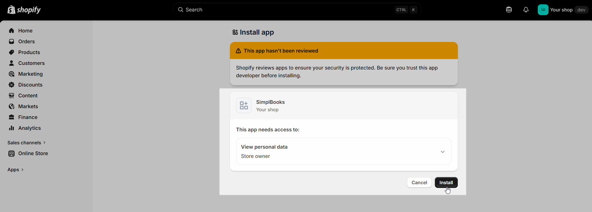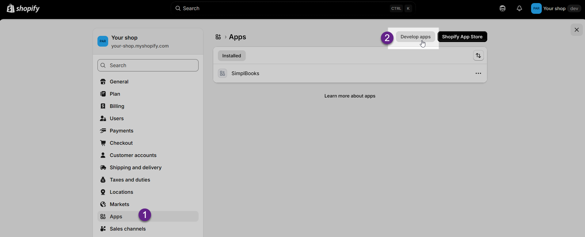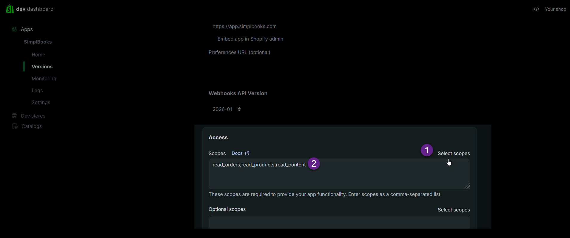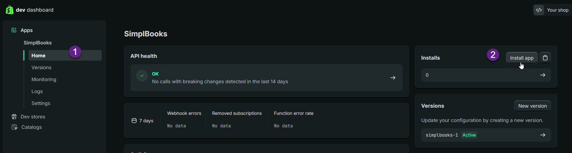 If “Dev Dashboard” displays a “Forbidden” error message during these two steps, use the older SimplBooks guide for Shopify integration (you will find it at the end of the Estonian guide).