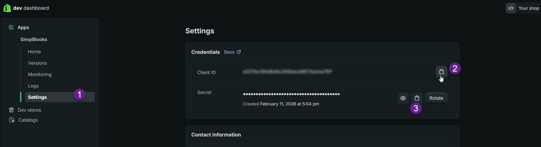 Then go to “Settings” in the left menu and copy Client ID and Secret. These are needed on the SimplBooks side in the Shopify integration activation settings.