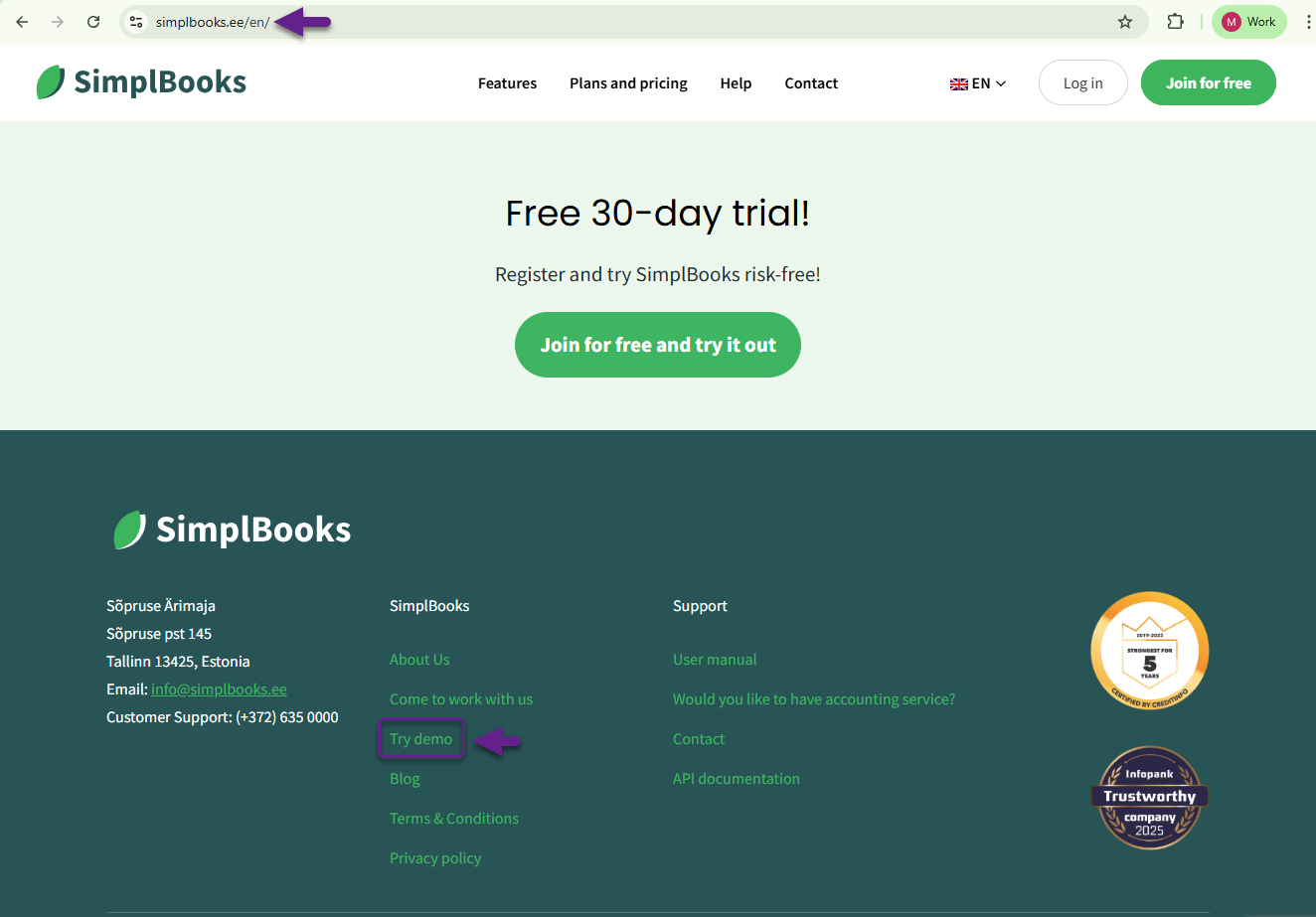 1. To explore the demo, click on the “Try Demo” link on the SimplBooks homepage. The link is located at the bottom of the page on a dark background.