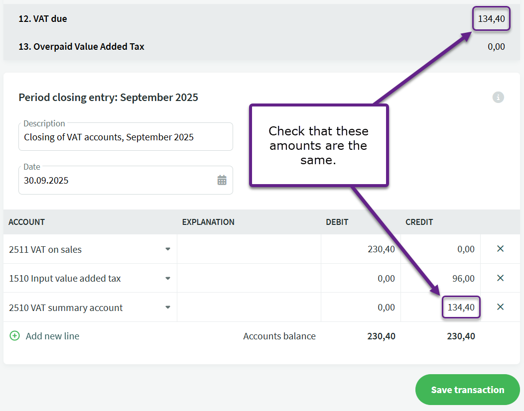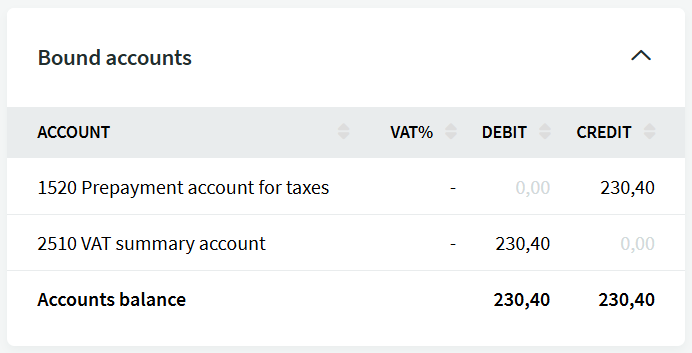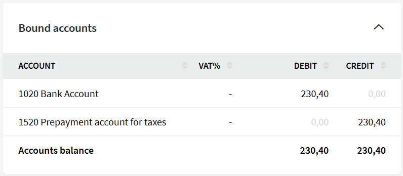 ● If you have made a bank transfer to the Tax Authority’s account after submitting the declaration, you need to enter a financial transaction in the system for this payment. This can be done under Accounting -> Transactions by clicking the New transaction button in the upper right corner of the transaction list, or the transaction can be recorded automatically during the bank import process. ● The offset between the VAT liability and the prepaid tax account is usually processed by the Tax Authority on the tax due date (the 20th of the month). If the payment is made after the due date, the amount will be posted to the prepaid tax account upon receipt. To reflect this transaction in SimplBooks, an additional financial entry must be made between the prepaid tax account and the VAT summary account.● Additional information on VAT-related transactions can also be found in the guide Frequently used accounting transactions, section 6.