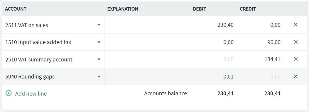 The closing entry can be found under the VAT statement for the respective month. This entry clears the output VAT and input VAT accounts, and records the VAT amount payable or overpaid for the period on the VAT summary account. ● Sometimes, there may be slight differences between the calculated amounts and the totals in the general ledger entries. In such cases, it is important to ensure that the VAT summary account reflects the same amount as reported in the VAT return submitted to the Tax Authority. The difference should be added to the rounding account (5940 Rounding gaps). In most cases, the system is able to detect the difference and adds the rounding automatically.