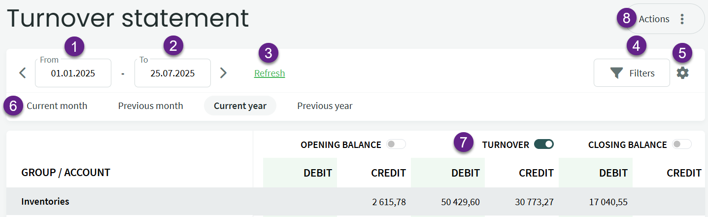- Filters – displayed if projects have been added in the settings, allowing you to view the turnover statement by project