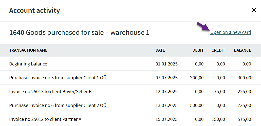● By clicking on a row in the statement, the account transactions view will open. Clicking the link “Open on a new card” will open the main ledger view, from where you can navigate to the transaction view for editing.