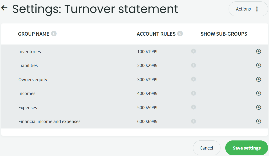 - Actions button – use to export the report (save or print) and modify the statement settings.