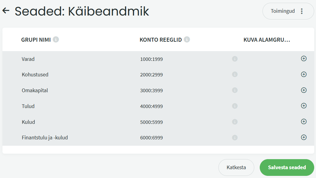 - Algsaldo, käive ja Lõppsaldo veergude andmeid saab kuvada nii kontode lõppsaldodena, kui deebet ja kreeditpoole saldodena. Muutmiseks klõpsake veeru nimetuse kõrval oleval nupul.