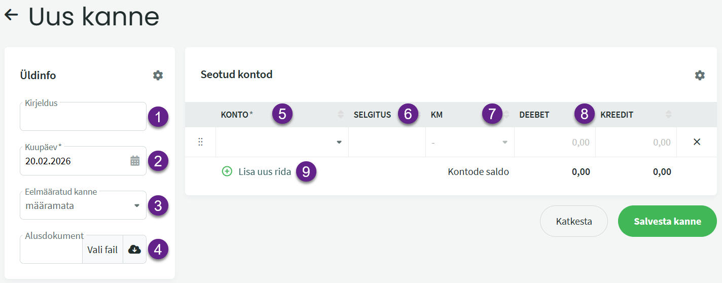 Raamatupidamine -> Kanded -> Uus kanne