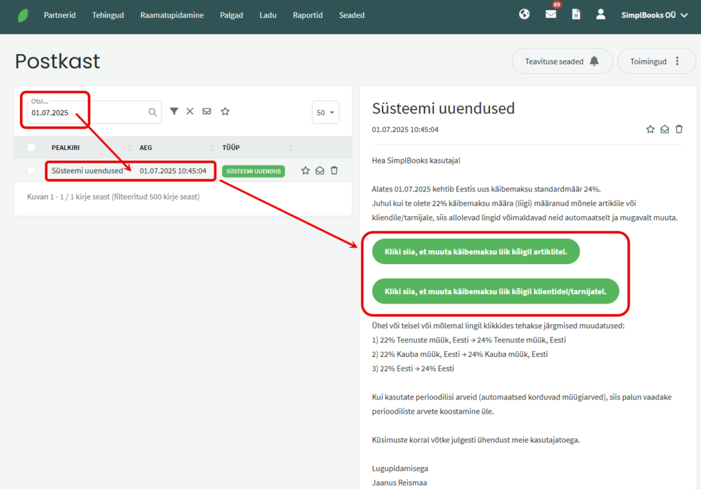 SimplBooks kontole sisseloginuna otsige postkastist üles kiri, kus saab kahe klikiga selle muudatuse ära teha. Sisestage otsinguväljale “01.07.2025” ning valige Süsteemi uuenduste kiri. Vastavalt juhistele klikkige mõlemal nupul: