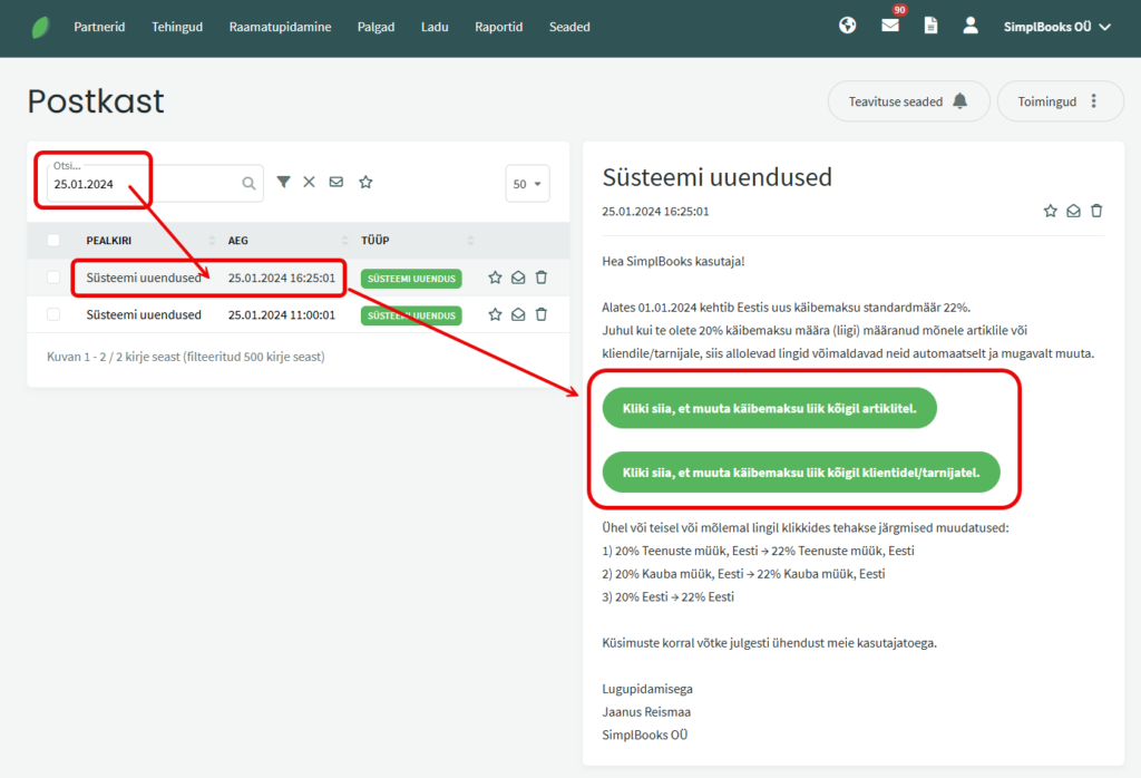 SimplBooks kontole sisseloginuna otsige postkastist üles kiri, kus saab kahe klikiga selle muudatuse ära teha. Sisestage otsinguväljale “25.01.2024” ning valige kellaajaliselt hilisem kiri. Vastavalt juhistele klikkige mõlemal nupul: