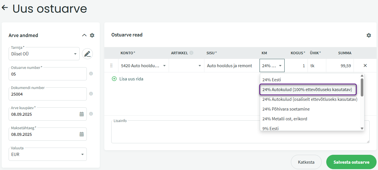 Ostuarve sisestamisel valige sobiv kulukonto ja valige käibemaksu liigiks “24% Autokulud (100% ettevõtluseks kasutatav)”