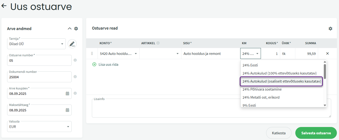 Ostuarve sisestamisel valige sobiv kulukonto ja valige käibemaksu liigiks “24% Autokulud (osaliselt ettevõtluseks kasutatav)“.