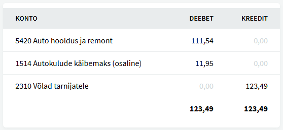 Sisendkäibemaksu kontona kasutatakse kontot 1514 Autokulude käibemaks (osaline), mis kajastub käibemaksu aruandes real 5.4.