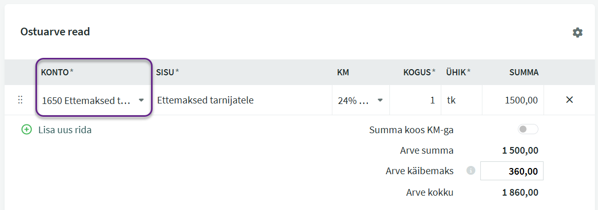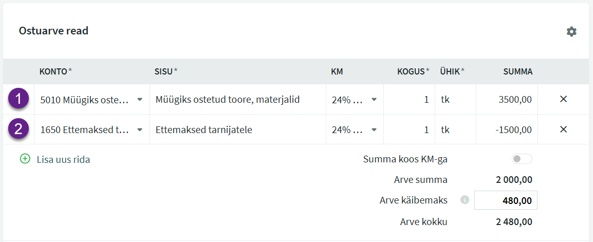 Lõpposa arve: 3500 eurot (kulu real), ettemaks 1500 (miinusega). Arvel kajastub käibemaks summas 480 eurot (kauba ja arve saamine detsembris).