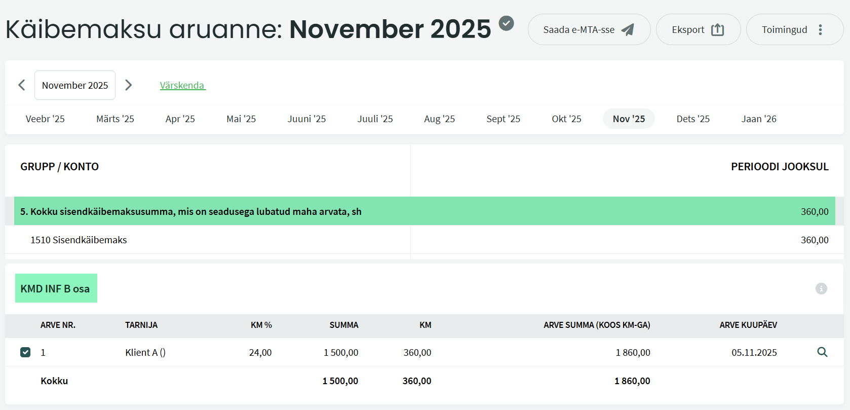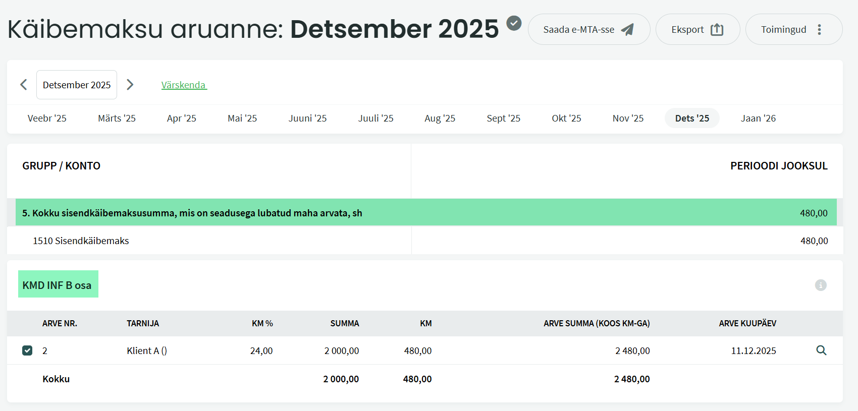 Tulemuseks peab olema see, et kahe ostuarve (ettemaksearve + lõpparve) kokkuvõttes on sisendkäibemaksuna tagasi arvestatud summa võrdne kogusummast arvestatud käibemaksu summaga, s.t 360+480=840.