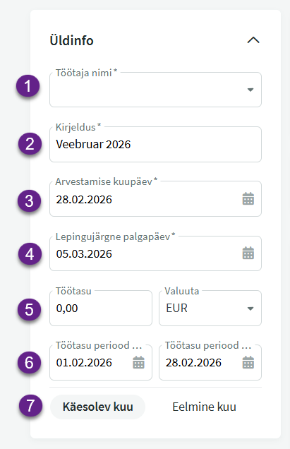Juhendis käsitleme ühekaupa uue töötasu lisamist. Uue töötasu lisamise vaates on viis paneeli: