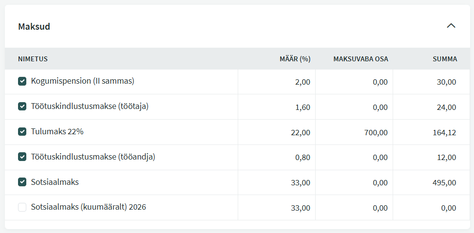 Te saate ise valida, millised töötasud makstuks märgitakse. Töötasude väljamaksete summasid saate muuta “Töötajale” veerus, maksude väljamaksel on summad “Maksud veerus”.