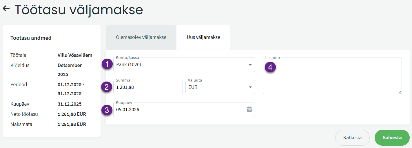 - Märkida käsitsi makstuks – tuleb sisestada väljamakse kuupäev ja valida õige pank (kui on mitu)