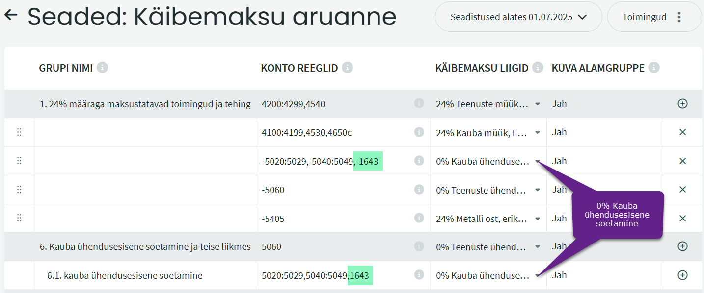 Lisage rea 1 “0% Kauba ühendusesisene soetamine” käibemaksu liigi juurde kontode reeglitesse vajalik lao konto (nt 1643 Ladu – ühendusesisesed ostud). Eraldage konto teistest kontodest komaga, tühikut ärge vahele pange ja konto ette kindlasti miinusmärk.