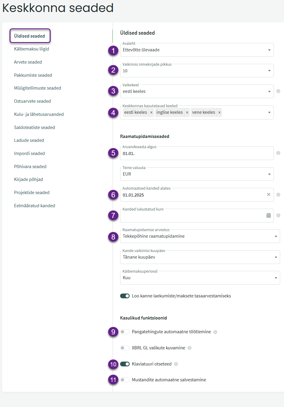 - Aruandeaasta algus – kattub tavapäraselt kalendriaasta algusega. Kui ettevõtte asutamisel on valitud teistsugune periood, siis tuleb see siin ära märkida. Kui aruandeaasta algust muudetakse, siis tuleb enne selle siin muutmist eelnev periood ära lõpetada ja kanded lukustada. Samuti on parem muuta automaatsete kannete alguskuupäeva.