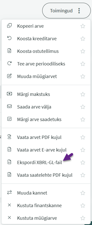 Pärast võimaluse aktiveerimist tekivad programmis lisavalikud müügiarvete ja ostuarvete nimekirjades ekspordi nupu alla ning müügiarve ja ostuarvete vaates Toimingute nupu menüüsse.
