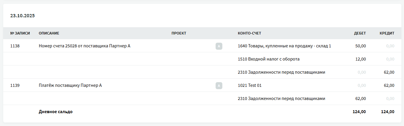 ● При нажатии на строку записи откроется финансовая запись. Нажав на кнопку «Открыть в новой карте», откроется просмотр записи. При необходимости запись можно открыть для редактирования. ● Буква «A» в строке записи означает, что запись создана системой, а не внесена вручную, и пользователь ее не изменял. ● Чтобы экспортировать дневную книгу, нажмите кнопку «Действия» (в правом верхнем углу) и выберите «Экспорт отчета». В открывшемся окне будут показаны форматы, в которых можно сохранить отчет, либо можно выбрать печать отчета.При возникновении вопросов напишите нам на support@simplbooks.ee