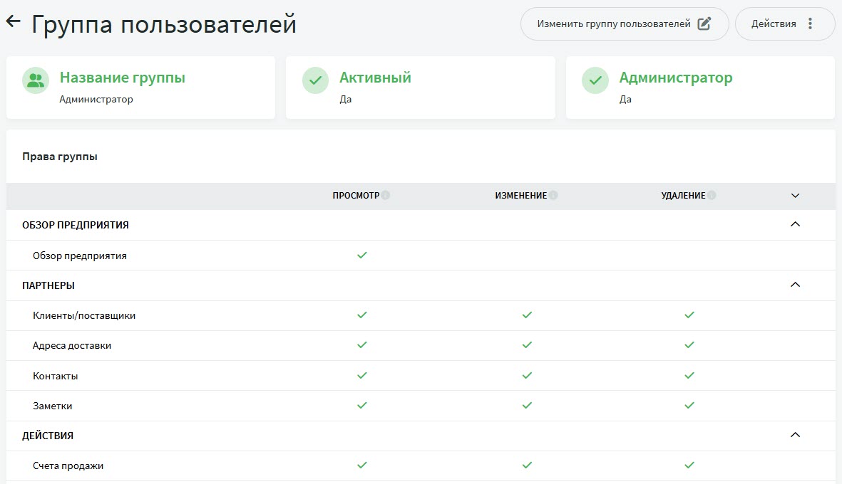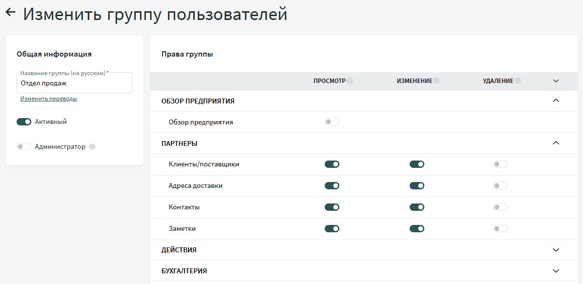 - Отдел продаж — разрешено просматривать, изменять и добавлять только связанные с продажами документы и отчеты; удаление не допускается.