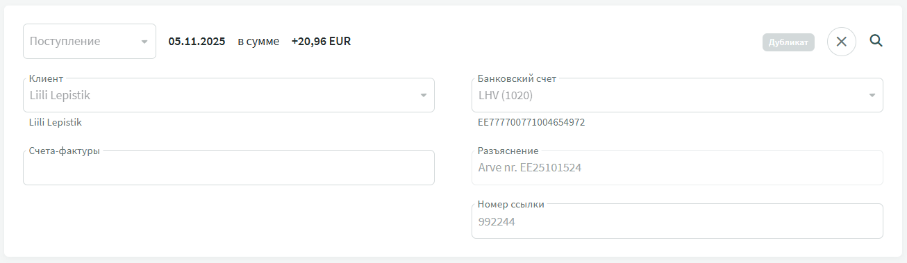 Все в порядкеВсе в порядке! Для поступления найдено соответствие с клиентом и счетом. Сделка корректна, и ее можно сохранить, нажав на зеленый кружок в правом верхнем углу. Ошибочный Сделку нужно сохранить как финансовую запись. Тип указан верно, но для сохранения записи необходимо добавить конто-счет. Укажите подходящий счет (доходов) и сохраните запись. Дубликат Это поступление уже было сохранено ранее, повторное сохранение не допускается. Удалите сделку, нажав на крестик. Сохраненное поступление можно посмотреть, нажав на иконку с лупой. Внимание! Найдено соответствие с клиентом, но не со счетом. Возможно, клиент ошибочно сделал двойную оплату. Сделку все равно можно сохранить — она будет отражена в ресконтро продаж как предоплата и позже может быть связана со следующим счетом этого же клиента.Исходящие сделки можно сохранять как платежи, выплаты заработной платы, выплаты налогов с заработной платы или как финансовые записи. Тип сделки отображается в левом верхнем углу строки банковской сделки, рядом с датой и суммой. При необходимости тип можно изменить, нажав на него.