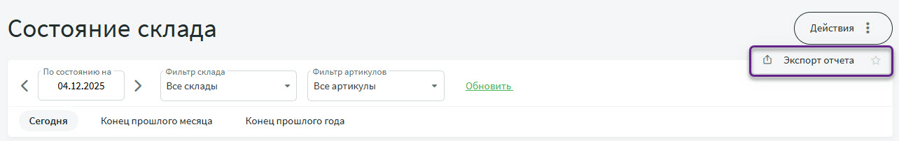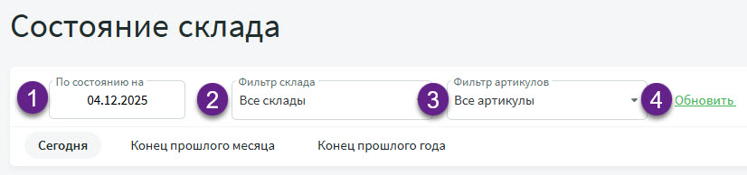 Отчет показывает складские остатки товаров по состоянию на выбранную дату. Данные можно фильтровать по складам и/или по артикулам.