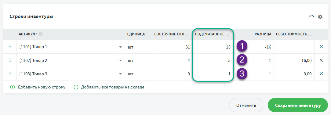 Если необходимо внести изменения, соответствующие артикулы нужно удалить из инвентаризации.