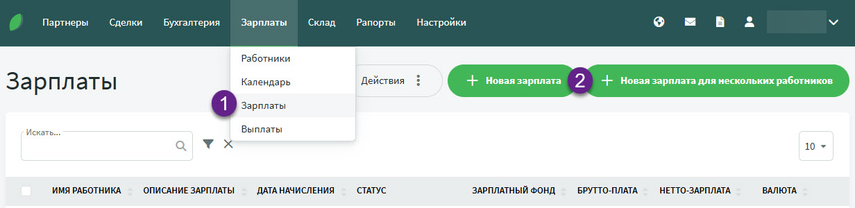 Для добавления зарплаты по одной нажмите кнопку «Новая зарплата», а для расчета зарплаты сразу для нескольких работников — «Новая зарплата для нескольких работников».